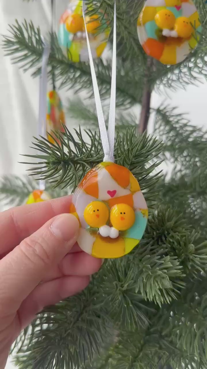 Chaque pièce est fabriquée à la main dans mon atelier au Québec à partir de verre fusionné. Le motif coloré du coco est composé de fragments de verre qui créent un effet mosaïque unique à chaque cuisson. Les deux poussins, eux, restent toujours les vedettes de l’ornement, avec leur air attachant.